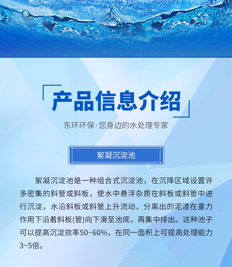 絮凝沉淀池是一種組合式沉淀池;在沉降區(qū)域設(shè)置許多密集的斜管或斜板,使水中懸浮雜質(zhì)在斜板或斜管中進行沉淀,水沿斜板或斜管上升流動,分離出的泥渣在重力作用下沿著斜板(管)向下滑至池底,再集中排出。這種池子可以提高沉淀效率50~60%,在同一面積上可提高處理能力3~5倍。